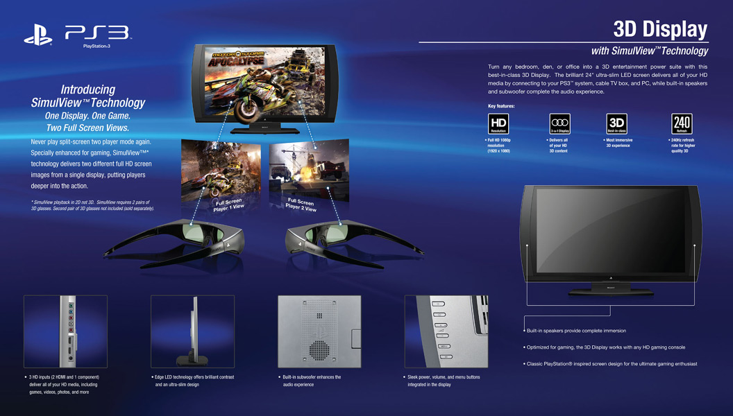 The PlayStation 3D display is specifically designed for superior 3D gaming and other digital media consumption right out of the box. The 24" Edge LED display comes bundled with a pair of PlayStation Active Shutter 3D glasses, a HDMI cable, and a copy of MotorStorm: Apocalypse for play on PlayStation 3 (console not included). When combined these items create a superior 3D gaming bundle tailor-made for PlayStation 3 players who want access to the best in 3D quality entertainment that is suitable for any sized gaming space. Additional features include: SimulView technology which delivers individual full HD screen visuals* to each player in two-player mode, built-in speakers and subwoofer, compatibility with cable TV boxes, and PCs, a 240 Hz refresh rate, full HD 1080p resolution, and two HDMI inputs and one component HD input. Video Games, Playstation 3, HD 3D